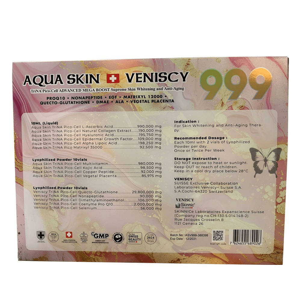 - Skin Brightening: Aqua Skin Veniscy 999 Glutathione Injection uses an IV infusion that efficiently penetrates your skin, delivering remarkable skin lightening results. Say goodbye to dull Safe and