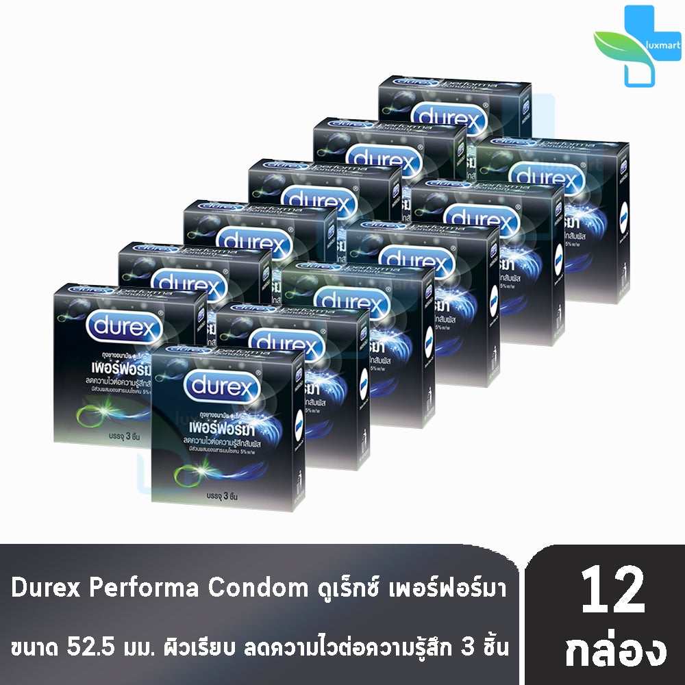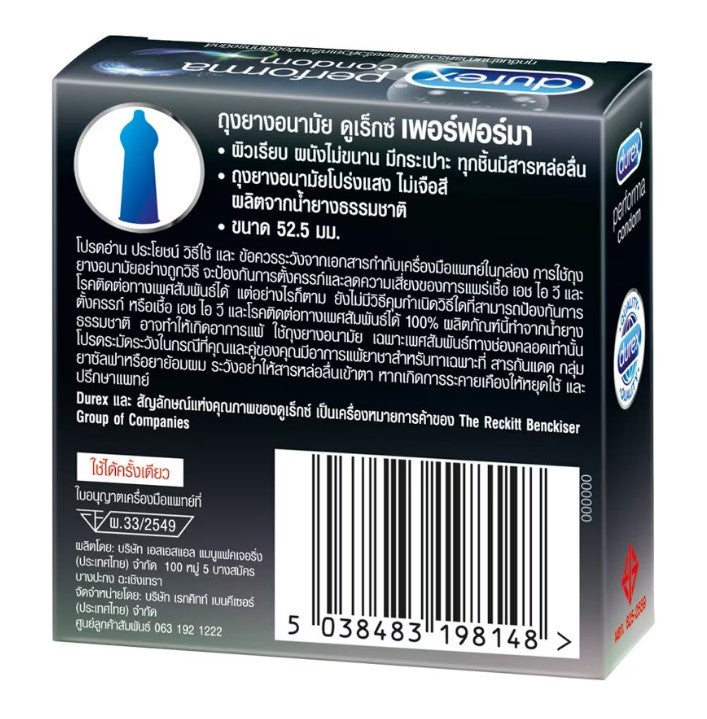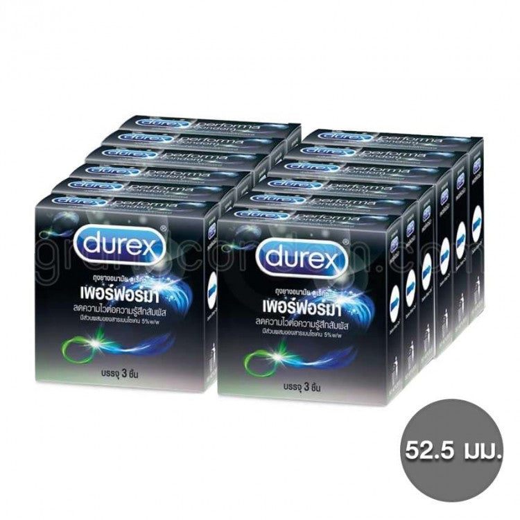 Durex Performa condoms contain a delaying agent, a 52.5 mm diameter, and reduce sensitivity. They contain 5% benzocaine.