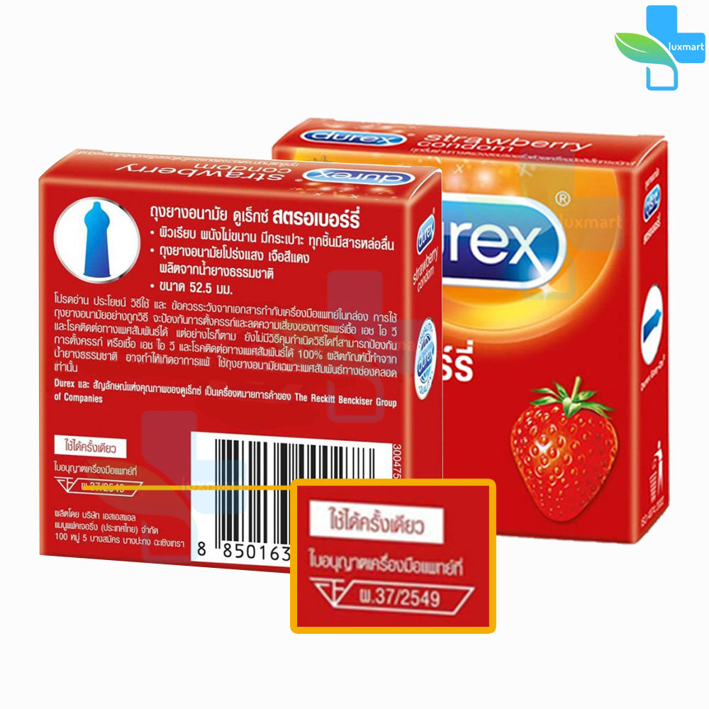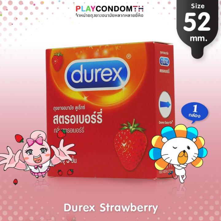 Ensure confidence in every important moment. 52.5 mm wide and 0.06 mm thick, they come with a built-in lubricant for a smooth glide. Made from high-quality, translucent, red-tinted natural latex with a strawberry scent. Each Durex Strawberry condom is uniquely tested to international ISO standards.