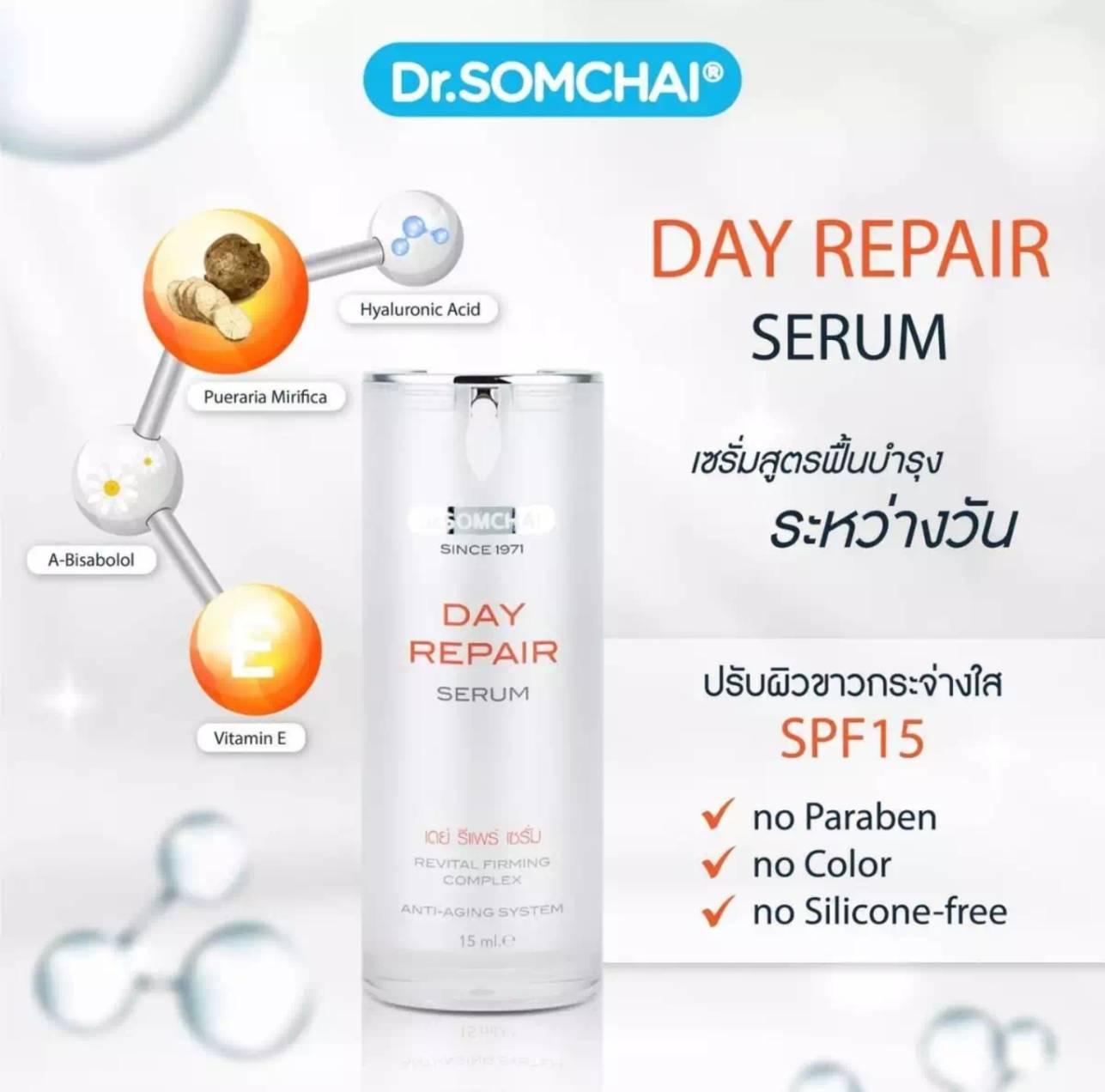 Dr. Somchai Day Repair Serum 15 g. A lightweight, fast-absorbing serum for daytime skin care that also protects skin from sun damage.