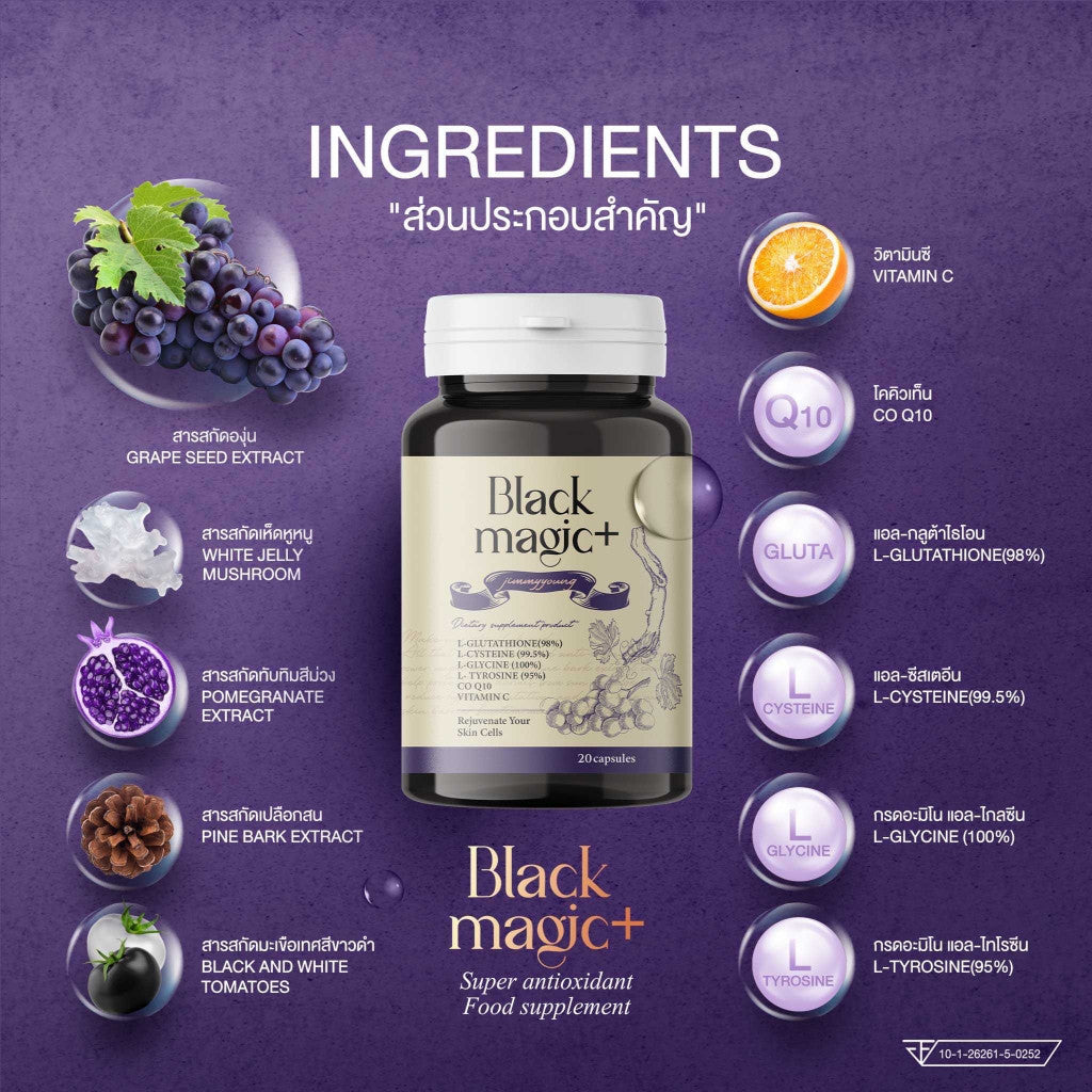 Black Magic Plus Gluta New formula Black gluta pills Skin work that cannot be found anywhere With concentrated anti-aging black fruit extract Packed in a single jar Packed with skin extracts Amount of mechanisms to accelerate white skin Aura skin concentrated See results quickly Produced from a factory that has received international standards