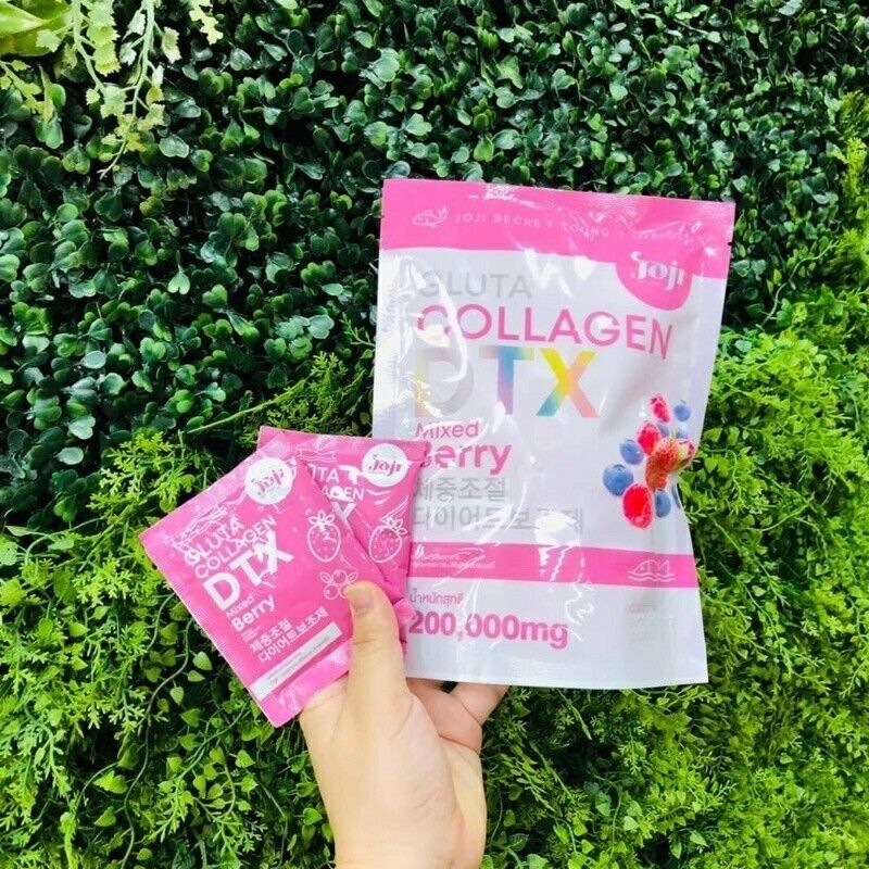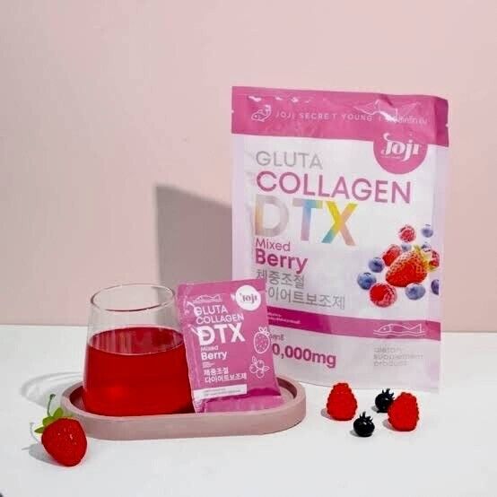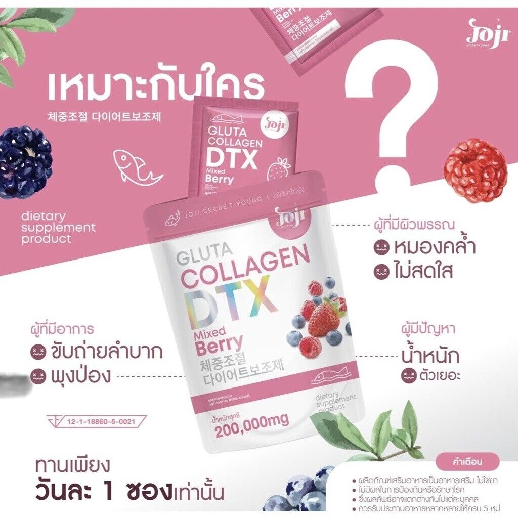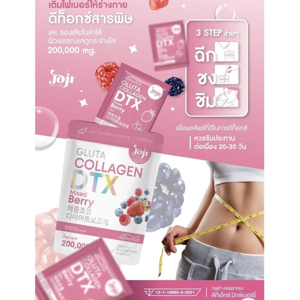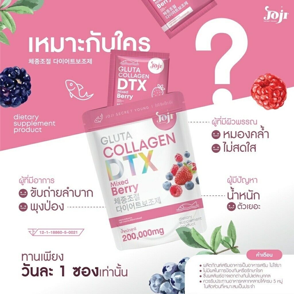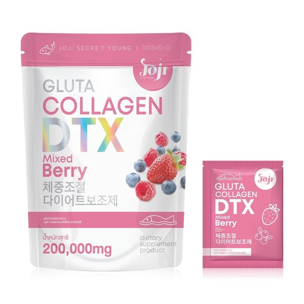 JOJI Gluta Collagen DTX Mixed Berry 10 Sachets Dietary supplement in powder form mixed berry flavor which contains a mixture of glutathione, collagen from marine fish and citrus fruit extract powders such as strawberries, raspberries and blackcurrants. The taste is mellow, fragrant, delicious and not fishy. Can drink easily and conveniently in 1 sachet with 100 cc cold water, stir to dissolve and drink immediately. Helps to whiten the skin and look good.