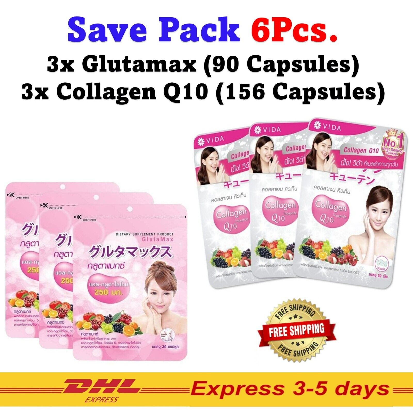 6x GLUTAMAX Vitamin C, Vida Collagen Tripeptide Fruit Extract Reduce Dark spots Anti Aging Expedited shipping by DHL express 3-5 business days delivery. **** Excluding Remote Area Surcharge **** Description Condition : New Type : Dietary Supplement Size : Glutamax L-glutathione 30 capsules / Pack Collagen Q10 52 Capsules / Pack Quantity : 6 Pack / Set Glutamax L-glutathione - 3 packs (90 capsules) Collagen Q10 - 3 packs (156 capsules) Glutamax L-glutathione - FDA Registration No.: 10-1-06453-1-0035 Collagen Q10 - FDA Registration No.: 10-1-06453-1-0213 Product detail & Benefit A supplementary food in capsule with nutritious ingredients consisting of high grade L-glutathione imported from Japan and other specially selected ingredients such as Vitamin C, Alpha Lipoic Acid, Pine Bark extract, Zinc, and other fruit extracts such as citrus, tomato, grape seed, all of which are full of nutrition and benefits. It enhances of your skin on every day for beautiful, smooth and soft skin in a healthy way. GlutaMax is for person with damaged skin, dark spot, dried skin, large pores, uneven skin tone, weary skin from not getting enough rest. Moreover, person with acne, blemish, dark spot, and acne scar is suitable for the product too. Or anyone who wants to better take care of their skin to stay radiant, good looking, and reinforce confidence not to mention those who want a good quality and safe supplement that can be taken regularly. It reinforces your confidence from the first time. We use the best quality glutathione from Japan which is certified by GRAS Certificate from American FDA. All ingredients are selected from high quality natural extract. Guarantee safety and trustworthiness. Can be taken every day safely. Approved by Thai FDA and all process are closely controlled by the expert pharmacist under GMP standard and Halal Thailand. Instruction: Take 1 pill dairy before bed when stomach is empty (1 hour before meal, 3 hours after meal) Take 2 pills to rapid change (1 pill before bed and 1 pill in the morning)