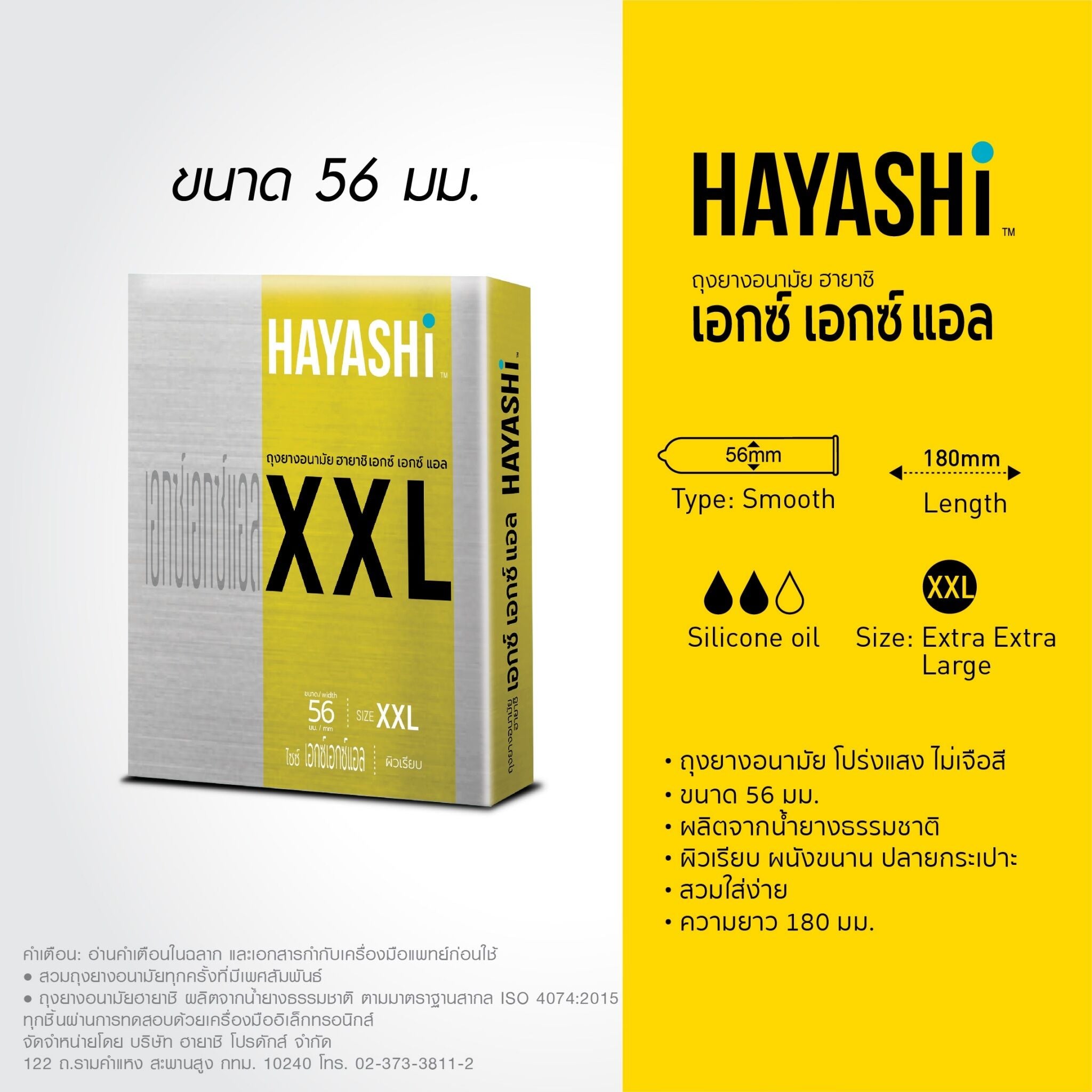 Hayashi XXL condoms. These 56mm condoms have a thickness of 0.06mm, making them ideal for larger Thai men. They make them easier to put on and take off, reducing the risk of over-tightness. Made from high-quality natural rubber latex, meeting international standards, and are electronically tested. Hayashi XXL 56mm condoms are extra-large condoms that are convenient to carry and protect against damage caused by carrying them in a pants pocket.