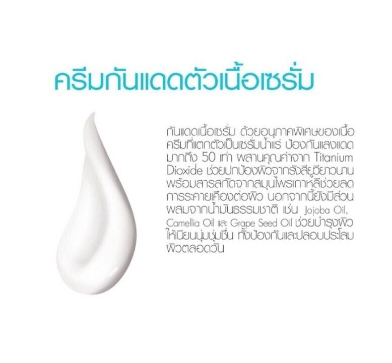 (Blue - Cool formula) Aqua sunscreen with special particles of gel texture that breaks down into a mineral water serum, which is light, non-greasy, easy to spread, absorbs quickly, protects from sunlight up to 50 times, combines the value of Titanium Dioxide to help protect skin from sunlight for a long time No matter how outdoor activities or when the sun is strong, it can handle it. How to use : Apply sunscreen all over the body 15 minutes before going out in the sun. The cream will break down into a serum that absorbs into the skin. for better results Should be used regularly and reapply every 2-4 hours.