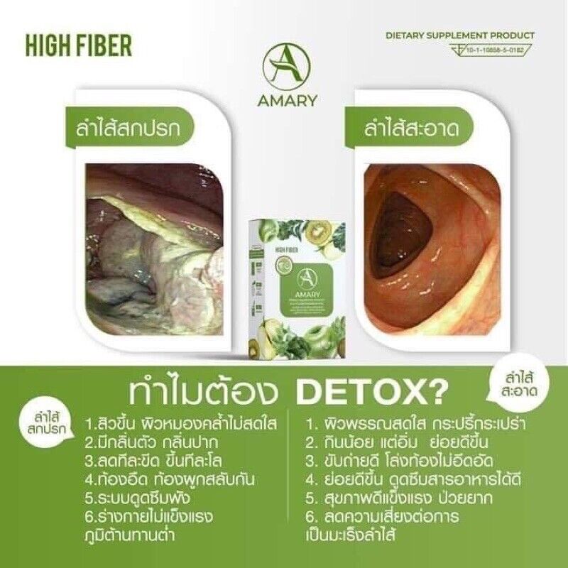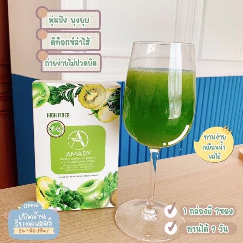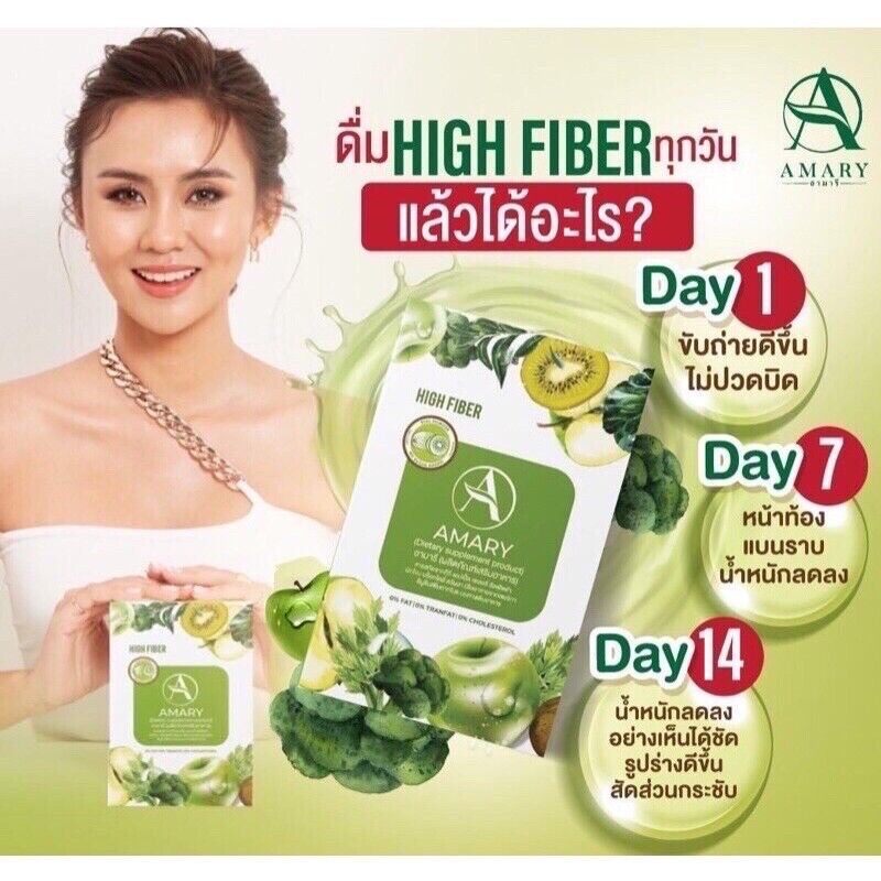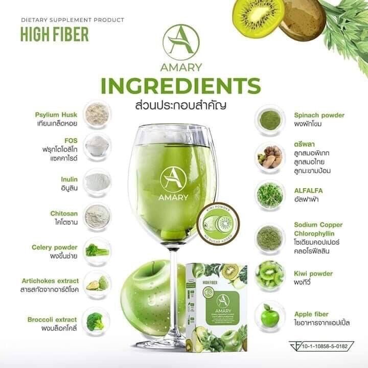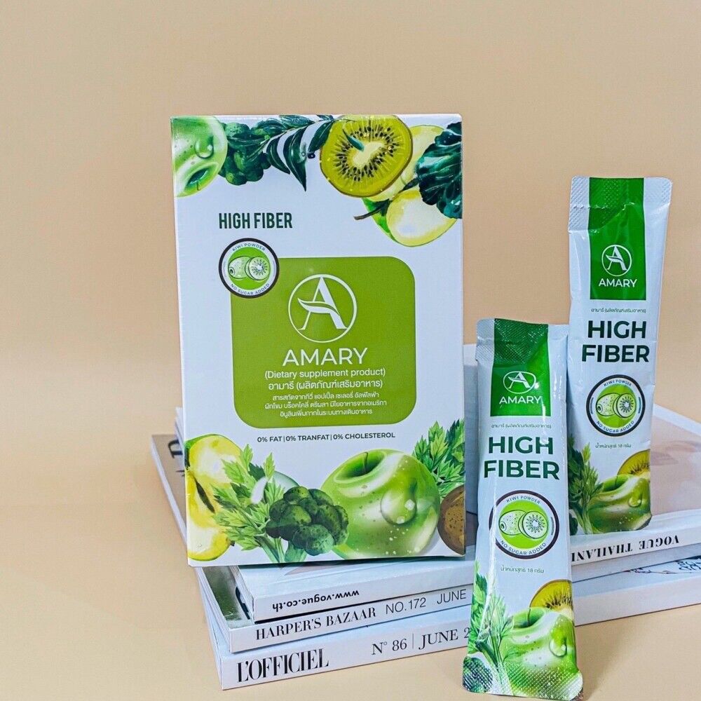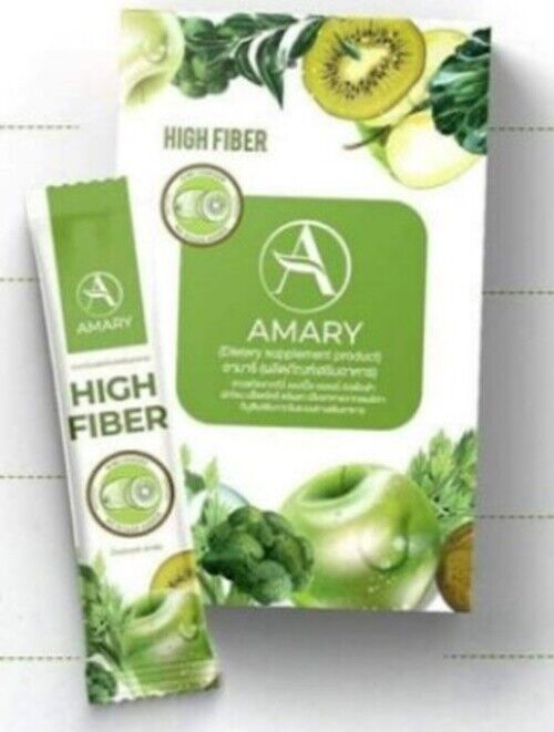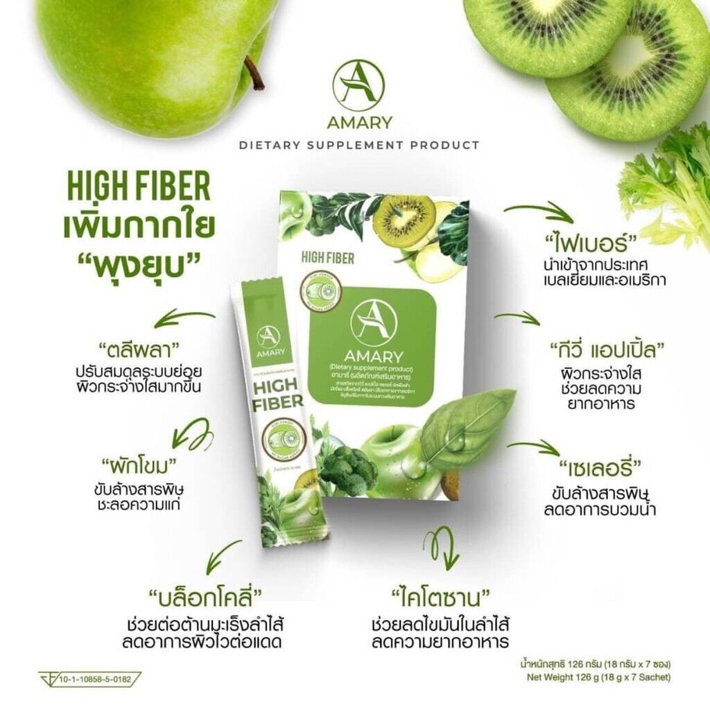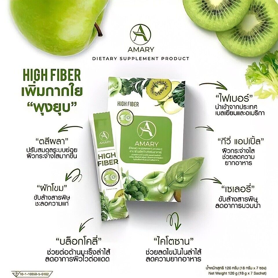 Amary High Fiber is a fiber dietary supplement that helps detox the intestines, improves the excretory system, helps control weight, helps brighten skin, promotes radiant skin, helps detox to reduce belly fats, promotes lean belly, promotes easy excretion, causes no twisted stomach and pain, helps reduce belly fats and accumulated body fats, reduces bad breath and body odor, and is easy to take. It has kiwi and apple flavor, has no sugar, and can be taken by diabetics. It provides only 60calories per 1 sachet.