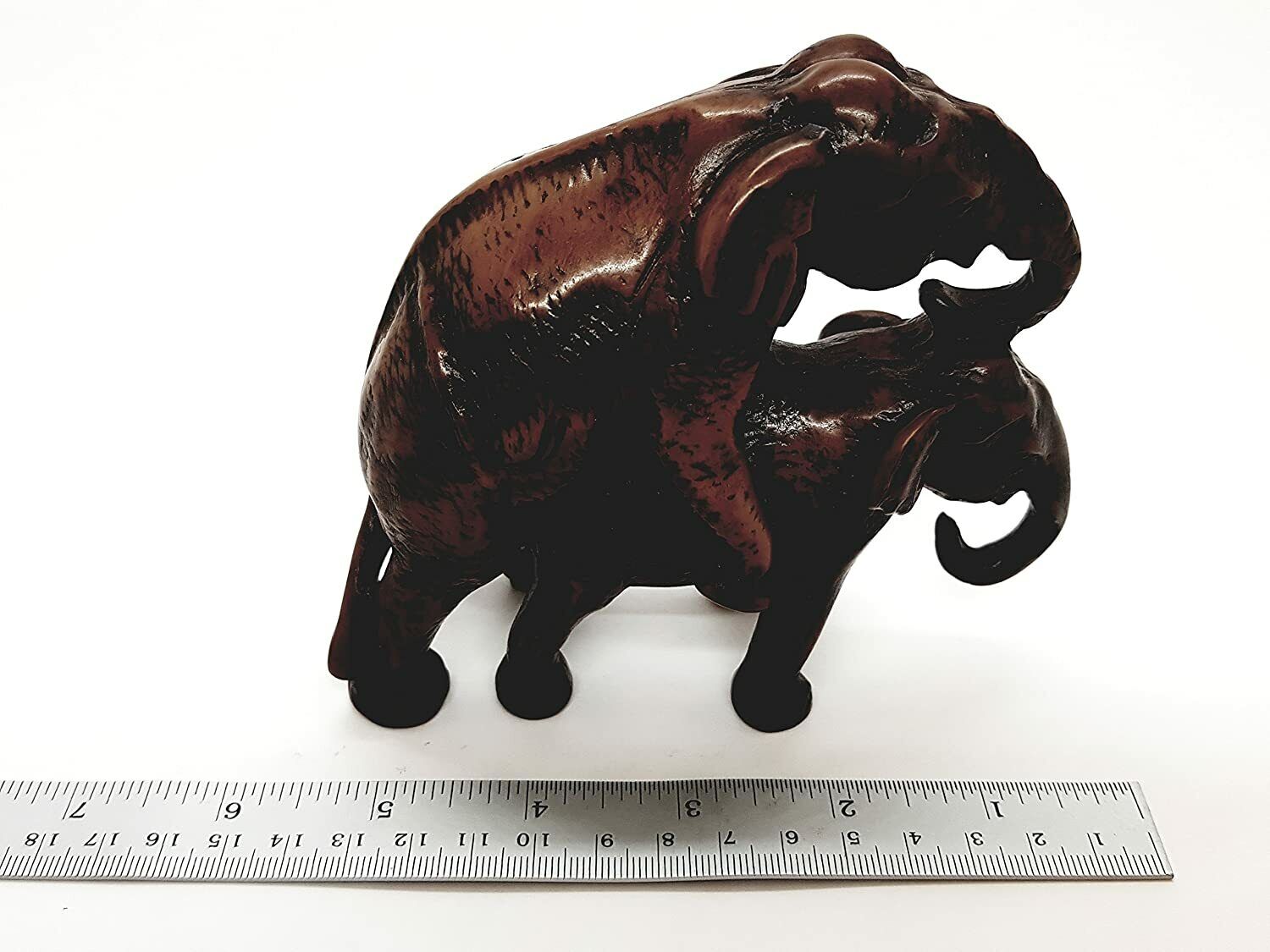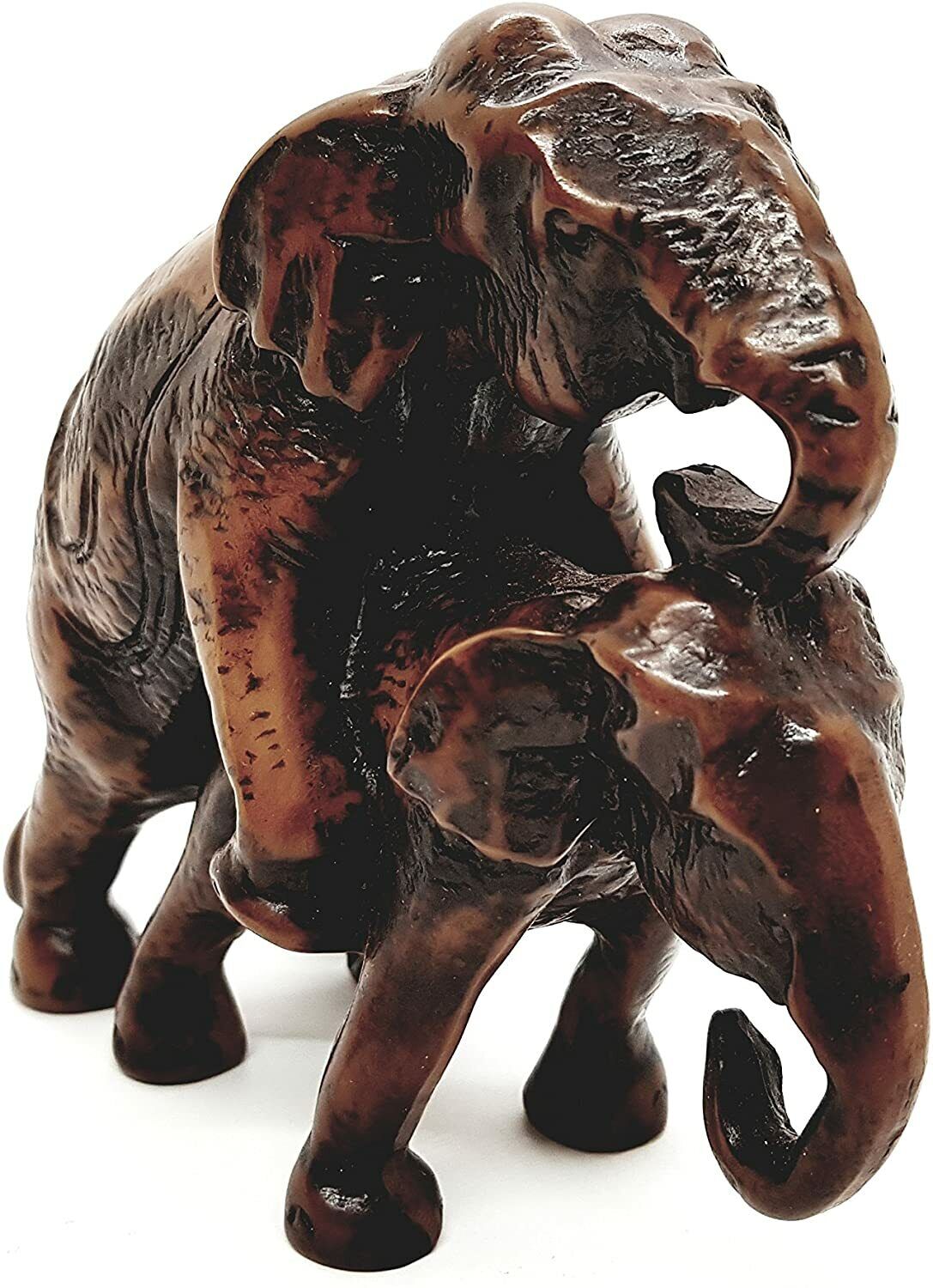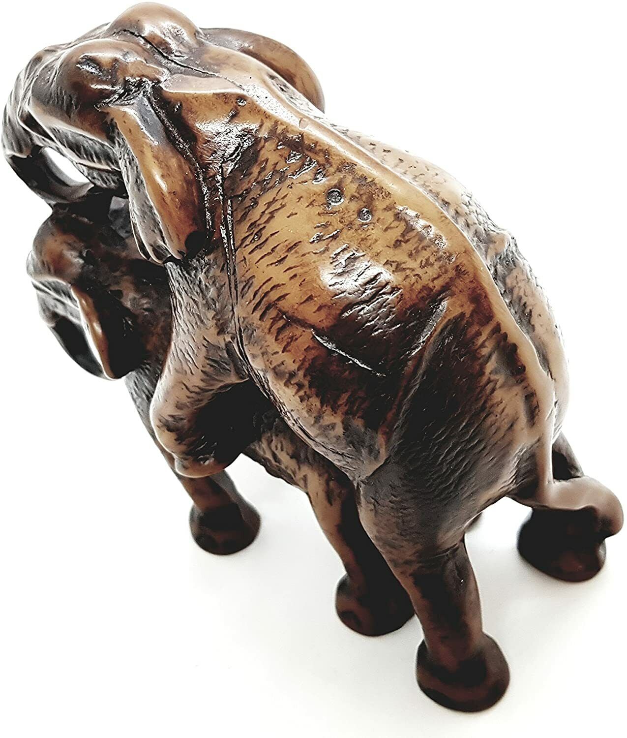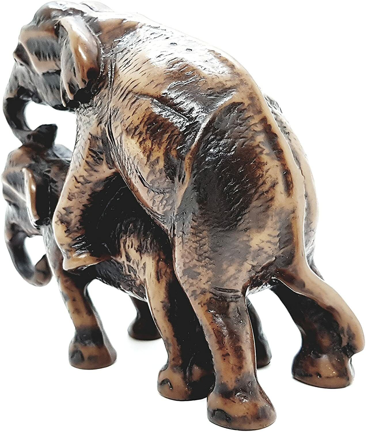 This carved elephant figurine is made from resin. Good for home decor and gift for elephant miniature's collectors.