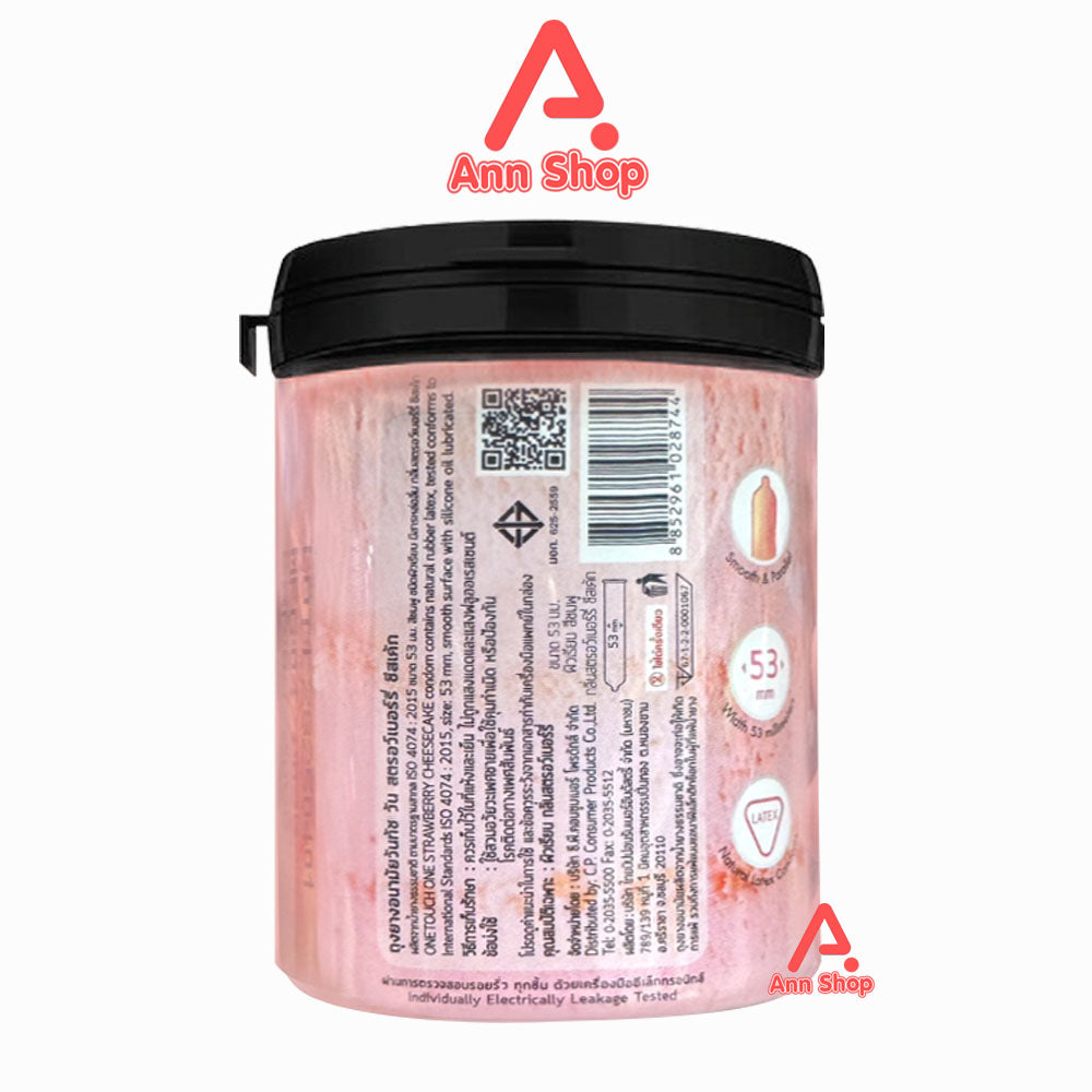 Onetouch One Strawberry Cheesecake, a smooth-textured 53 mm condom with a thickness of 0.05 mm. This popular Onetouch condom features a sweet strawberry cheesecake scent.