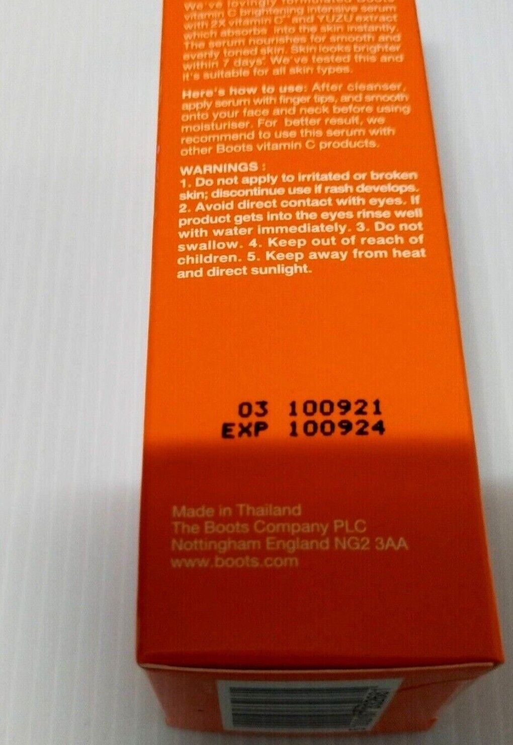 Boots Vitamin C Brightening Intensive Serum with concentraed 2 x vitamin C and YUZU extract is perfect for brightening dull skin and making skin tone evenly. With fast absorbing serum, this nourish skin deeply to make skin brighter and smoother within 7 days. This product is safe for all skin types. After cleaning your face, apply serum with finger tips and smooth onto your face and neck. You can see the better results within 7 days.