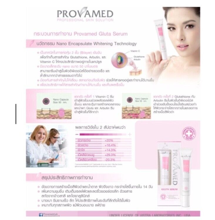The latest innovation, Nano Encapsulate Whitening Technology, helps to adjust the skin texture. Make the skin look dull. look brighter and more natural Ready to help soften the skin, not dryness, restore the skin to look smooth, firm, reduce wrinkles, deep grooves to be shallower and noticeably faded. With a unique key ingredient Provamed